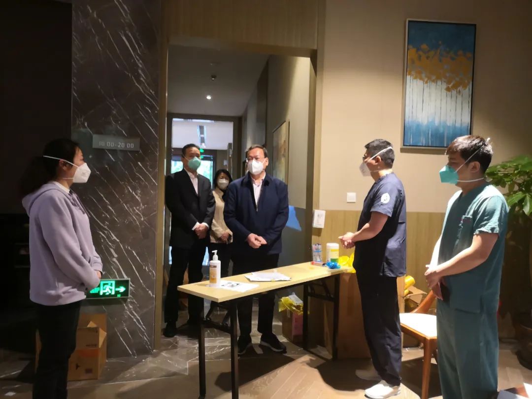 ▲ 上海市人大常委会副主任陈靖、上海市委政法委副书记陆民和上海浦东区委组织部副部长戚玉霞慰问医疗队